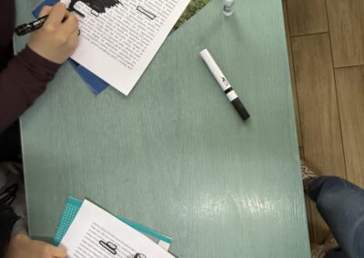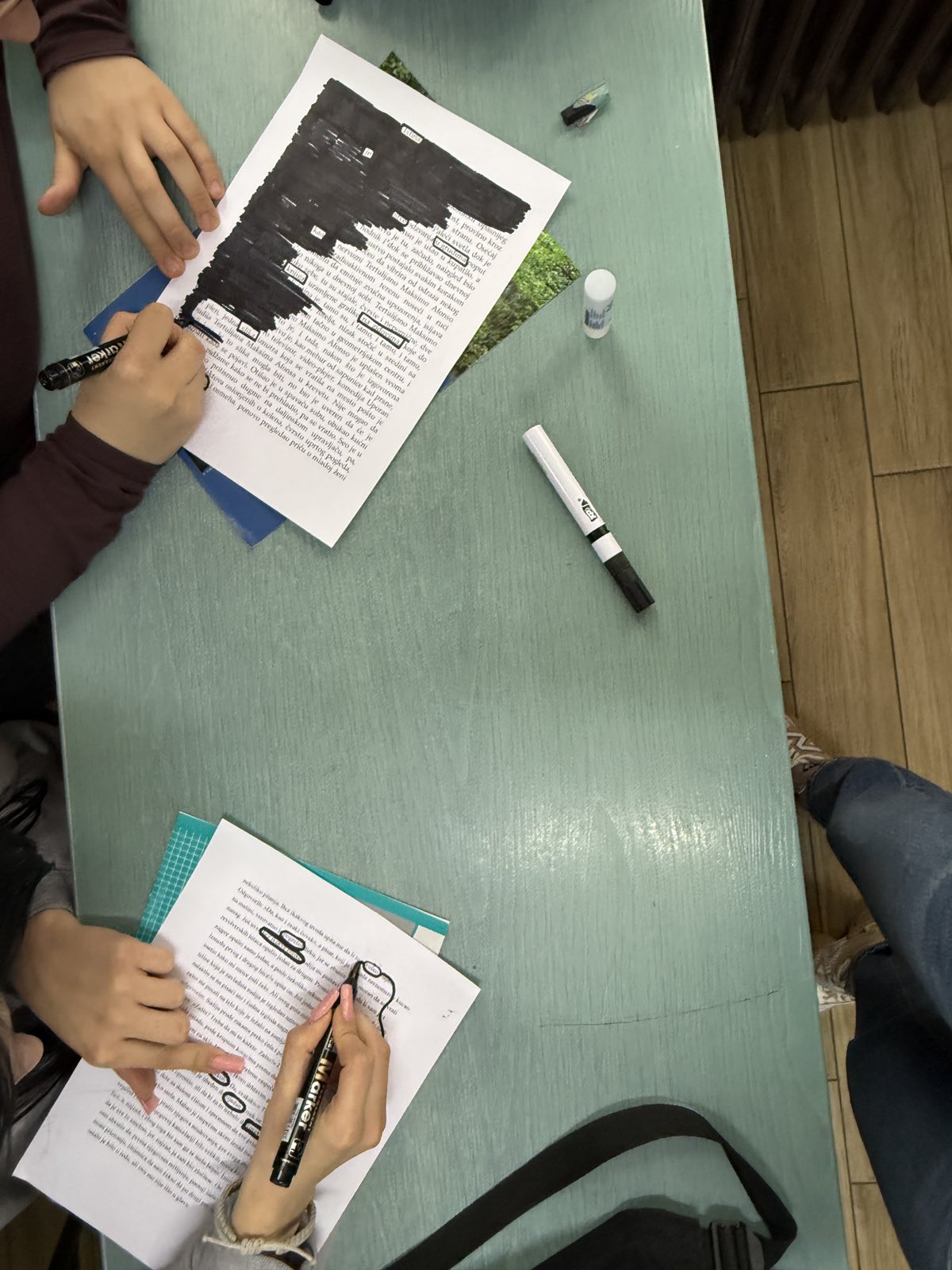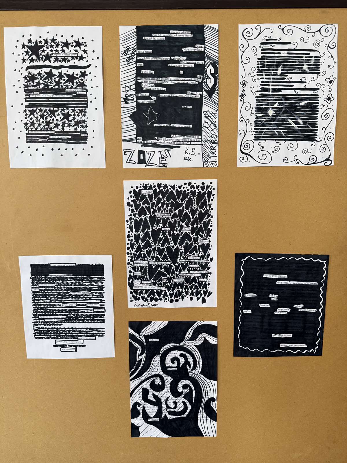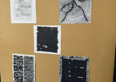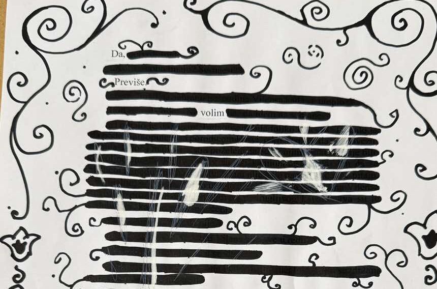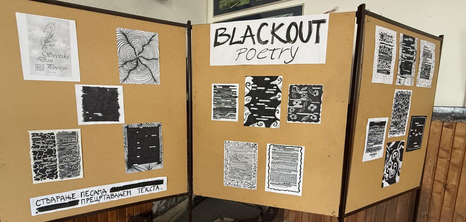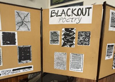 Шта јеBlackoutпоезија? Блиска је дадаистичким начинима креирања стихова – путем насумичних, нађених речи, само се у овом случају речи одабирају у постојећем драмском тексту (како би градиле поезију), а остатак речи се затамњује. Ученици су добили припремљене папире са изводима из књига или новина, прочитали би текст и затим одабрали речи које образује неки смисао, у облику поезије. Црним маркерима су прекривали речи текста које им нису потребне за њихову песму, али и ту су били креативни. Осим одабира неочекиваних речи, Blackout поезија омогућава и да се ликовно и визуелно изразимо при прекривању вишка речи црном бојом. У радионици су учествовала одељења К2, Т2, Е4 и Т4, а најуспешнији радови изложени су на изложби у холу школе.
