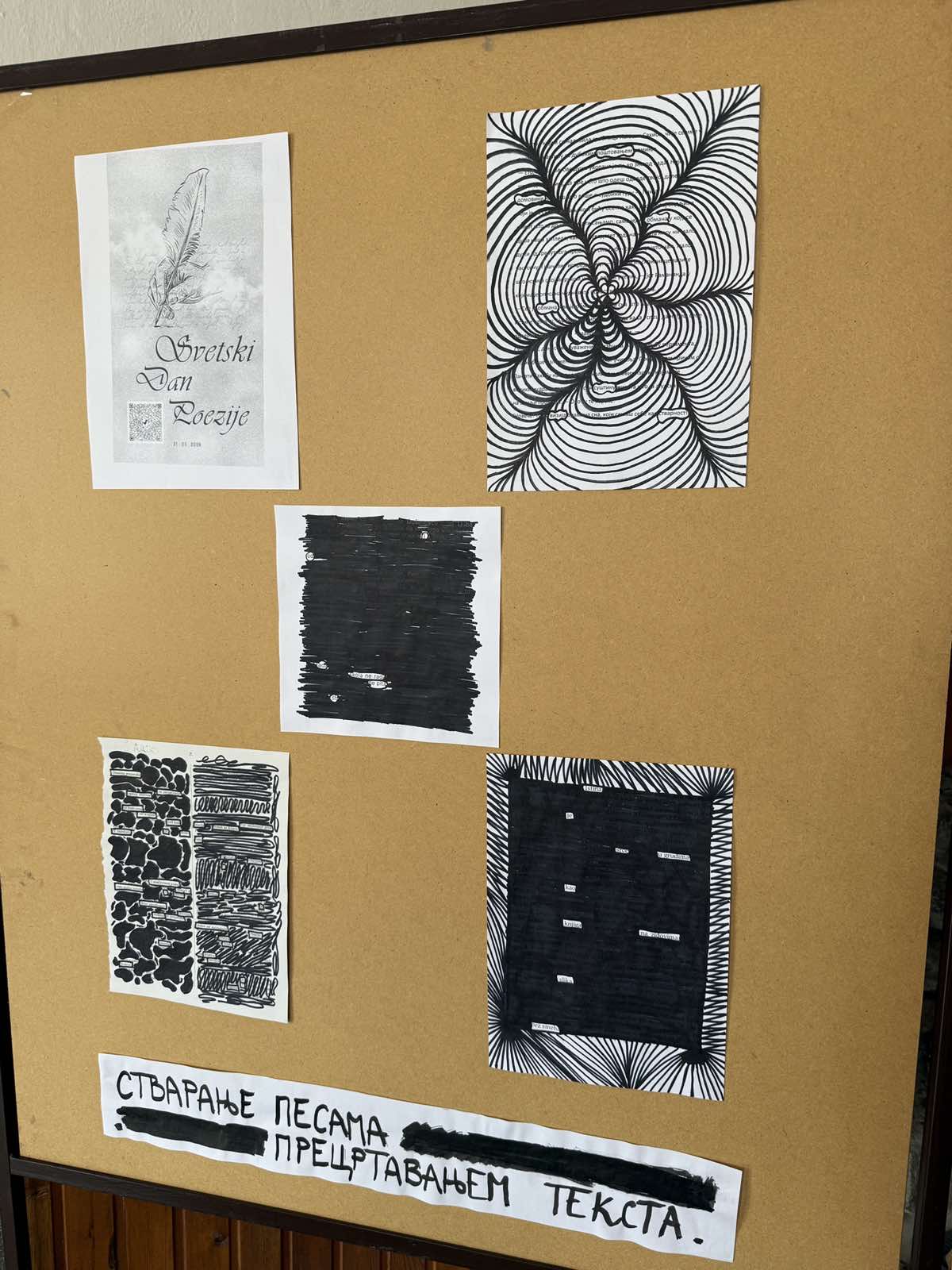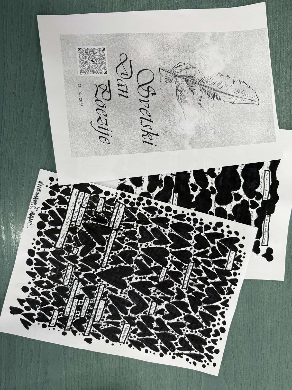 Светски дан поезије обележавамо 21. марта. У школском календару ове године то је била радна субота, што је погодовало да креативно ангажујемо наше ученике.Наставница ликовне културе, Смиљана Чурић инаставница српског језика и књижевности, Маријана Бољановић, кроз радионице у неколико одељења обележиле су овај дан. Радионице су се односиле на стварање поезије затамњивањем текста, тзв.Blackoutпоезију.
